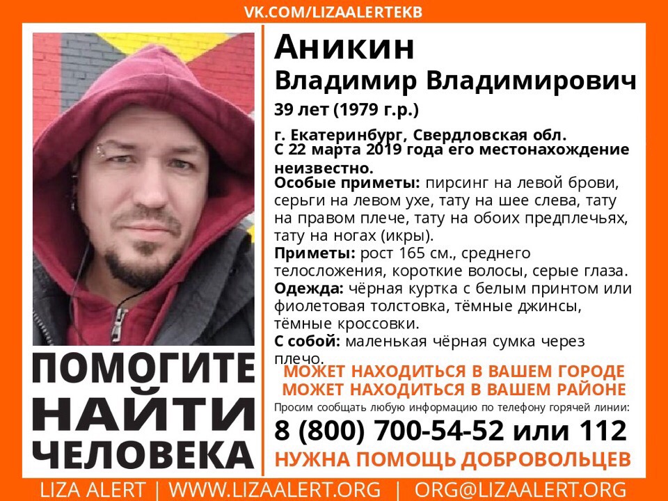 Если вам известна информация о примерном местонахождении Аникина Владимира Владимировича - сообщите об этом по тел. 8-800-700-54-52 или инфоргу поиска - тел. 899538225457 (Екатерина).