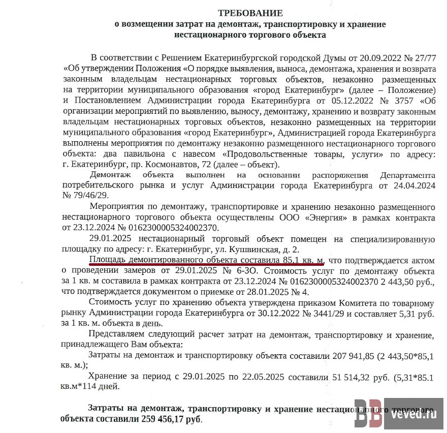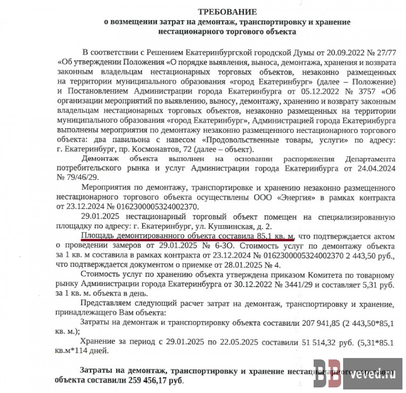 Спустя четыре месяца мэрия Екатеринбурга направила в адрес Екатерины Остаповой письмо, в котором потребовала возместить затраты на демонтаж, транспортировку и хранение НТО, и предоставила расчёт, согласно которому ей должны заплатить 259 тысяч рублей.