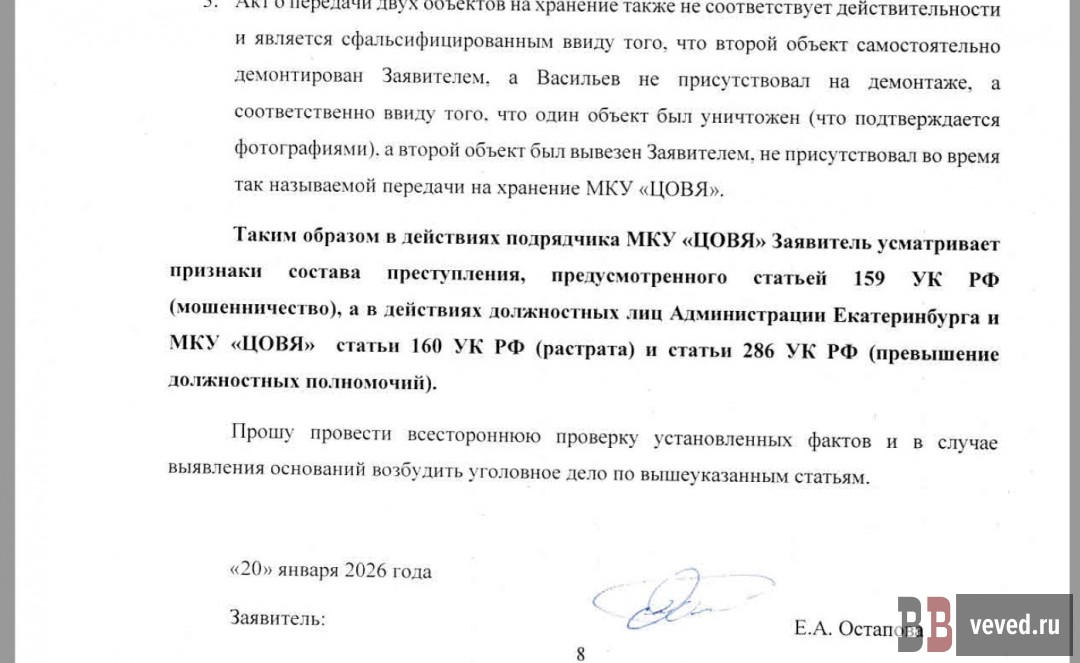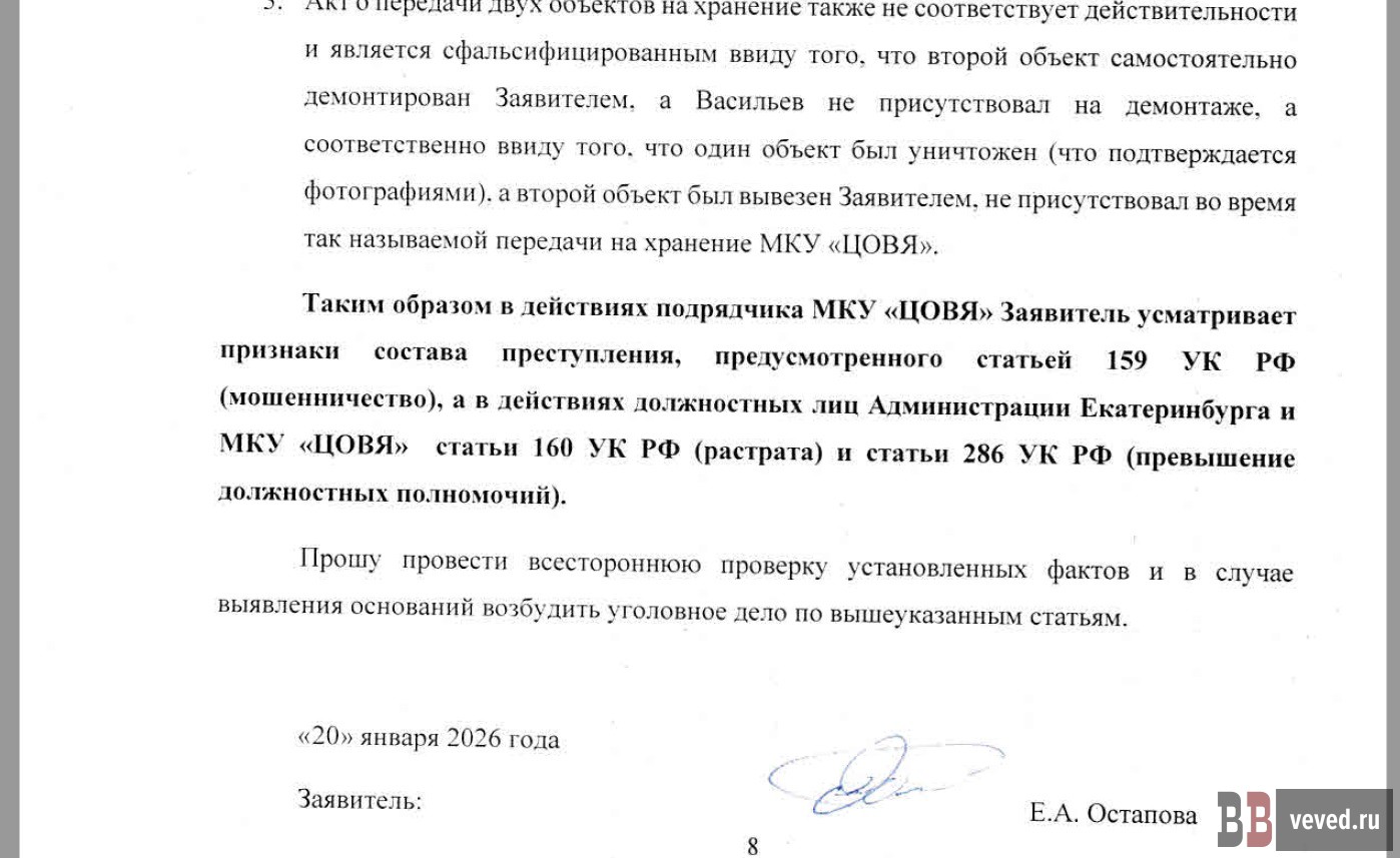 Однако, не дожидаясь решения по этому делу, предпринимательница обратилась в правоохранительные органы. Накануне было подано соответствующее заявление в Следственный комитет. По мнению заявительницы, в действиях МКУ «ЦОВЯ» можно усмотреть признаки статьи 159 УК (мошенничество) из-за завышения объёмов работ, а в действиях мэрии, оплачивающей такие работы, соответственно, признаки статей 160 УК (растрата) и 286 (превышение должностных полномочий).