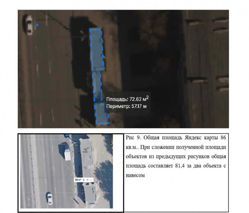 Несостыковка прослеживается и в указанной мэрией площади объекта — 85,1 кв.м. По расчётам владельца объекта, выполненным на основе данных цифровой платформы «Национальная система пространственных данных» и «Яндекс. картам», такая площадь может получиться, только если к снесённому павильону добавить площадь остановочного навеса и павильона «Пекарня», который был вывезен самостоятельно.
