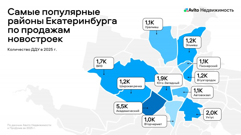 По итогам 2025 года чаще всего покупали жильё в новостройках Академического (5,5 тыс. ДДУ), Уктуса (2 тыс.), Юго-Западного (1,9 тыс.), ВИЗа (1,7 тыс.), Широкой Речки, Эльмаша и Втузгородка (по 1,2 тыс.). Отмечается рост интереса к Вторчермету: число ДДУ с 2022 по 2025 год выросло в 4,2 раза, проектов – с 3 до 16. В топ-5 по приросту ДДУ также вошли Втузгородок (в 2,4 раза), Юго-Западный (в 2,2 раза), Академический (+59%) и Пионерский (+32%).