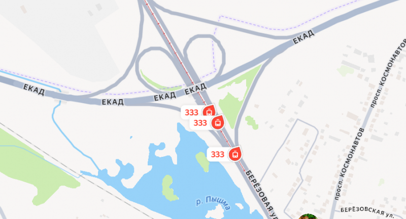 Трамваи встали перед ЕКАД из-за внезапного прекращения электроснабжения. Скриншот с «Яндекс.карт»