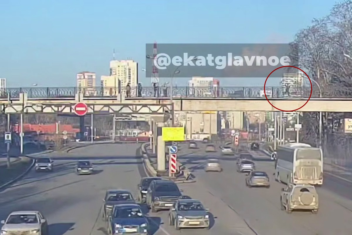 Кадры опубликовал близкий к мэрии канал «Екатеринбург. Главное». На видео видно, как электросамокат падает на крышу проезжающего под мостом автобуса, а затем – на проезжую часть.