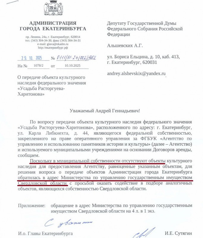 Мэрия Екатеринбурга попросило у властей Свердловской области найти здание для обмена с федеральным Минкультуры на усадьбу Расторгуевых-Харитоновых. Это следует из ответа вице-мэра и и.о. главы Екатеринбурга Игоря Сутягина депутату Госдумы от «Единой России» Андрею Альшевских.