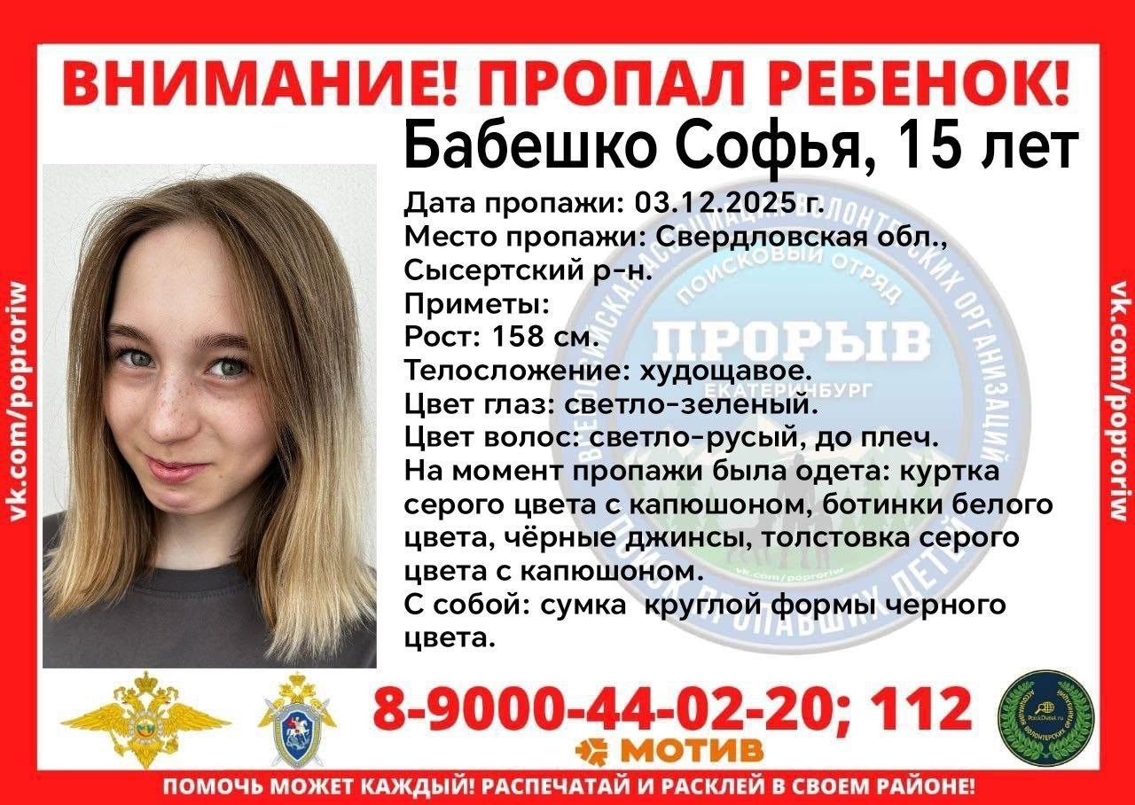 В Сысертском районе ищут 15-летнюю Софью Бабешко. Она пропала накануне, 3 декабря. Ориентировку на подростка публикует поисковый отряд «Прорыв».