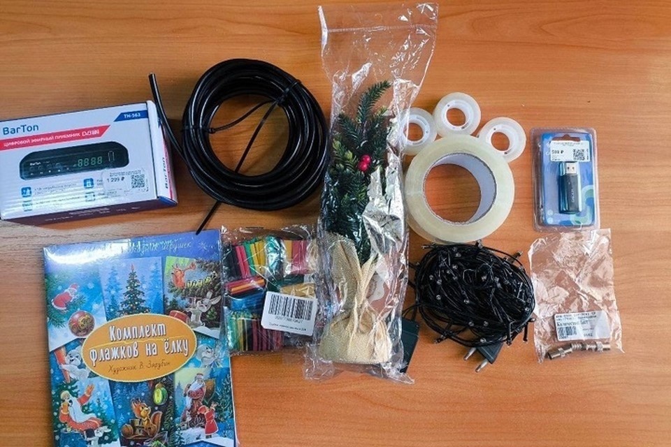 В сумке с документами находились гирлянда, искусственная ёлка, упаковка термоусадочных трубок, кардридер, переходники на телевизионную антенну, антенный кабель, цифровой приёмник, скотч и батарейки.