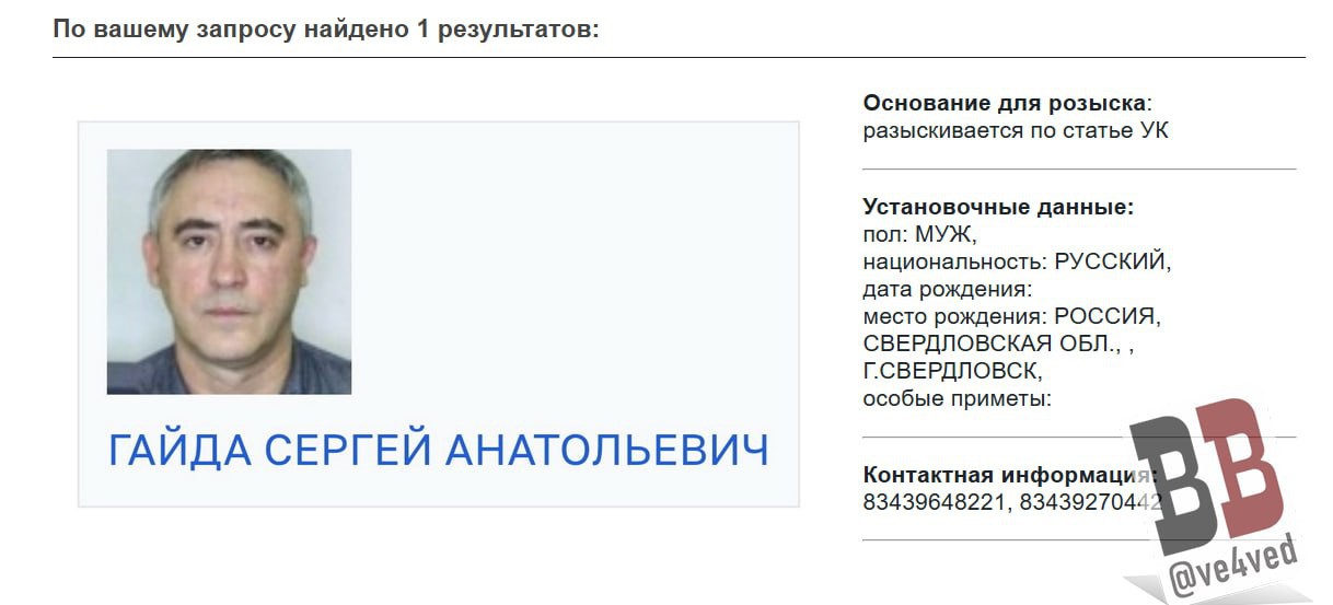 Карточку с информацией о розыске бывшего замминистра ЖКХ Свердловской области Сергея Гайды корреспондент Вечерних ведомостей обнаружил в публичной базе МВД России.