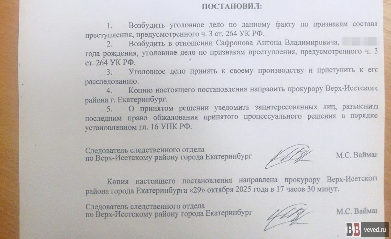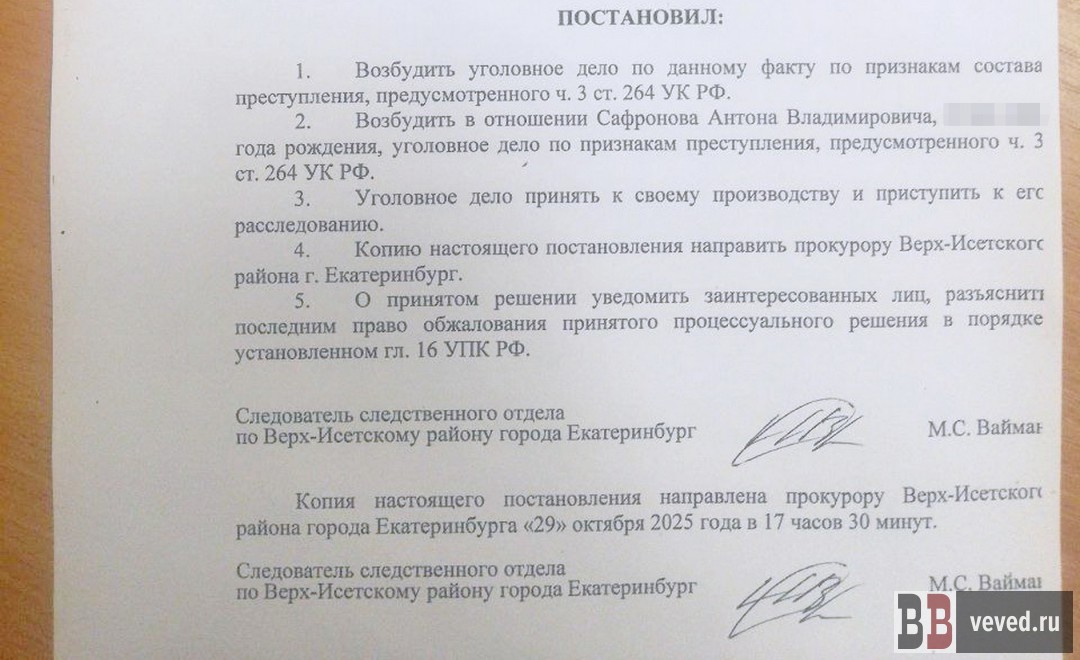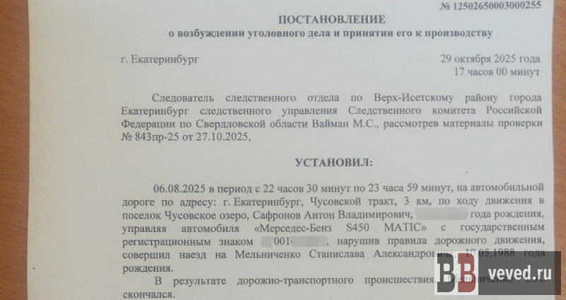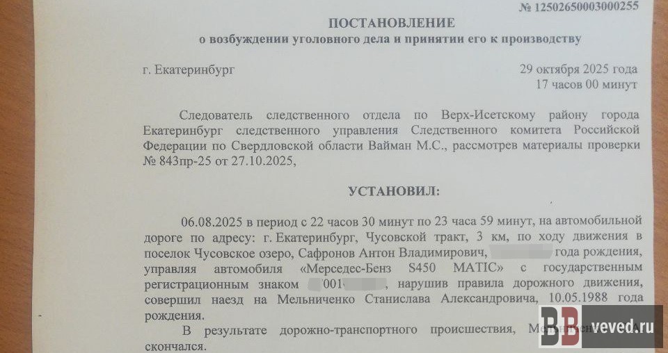 В Екатеринбурге возбудили уголовное дело против заместителя министра природных ресурсов и экологии Свердловской области Антона Сафронова. 39-летний чиновник на Чусовском тракте наехал на своём Mercedes на 37-летнего Станислава Мельниченко, в результате чего тот погиб на месте. Дело возбуждено по части 3 статьи 264 УК РФ (нарушение ПДД, повлёкшее по неосторожности смерть человека), предполагающей до пяти лет лишения свободы.