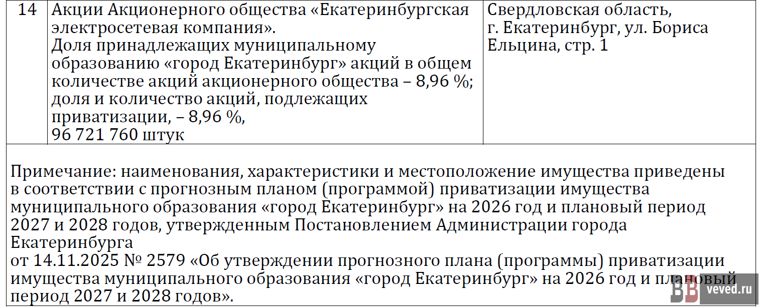 Таким образом, город планирует полностью выйти из капитала сетевой компании — это последняя доля муниципалитета в распределительном электросетевом бизнесе. Продажа предусмотрена программой приватизации имущества Екатеринбурга на 2026–2028 годы, утверждённой постановлением администрации города от 14 ноября 2025 года № 2579.