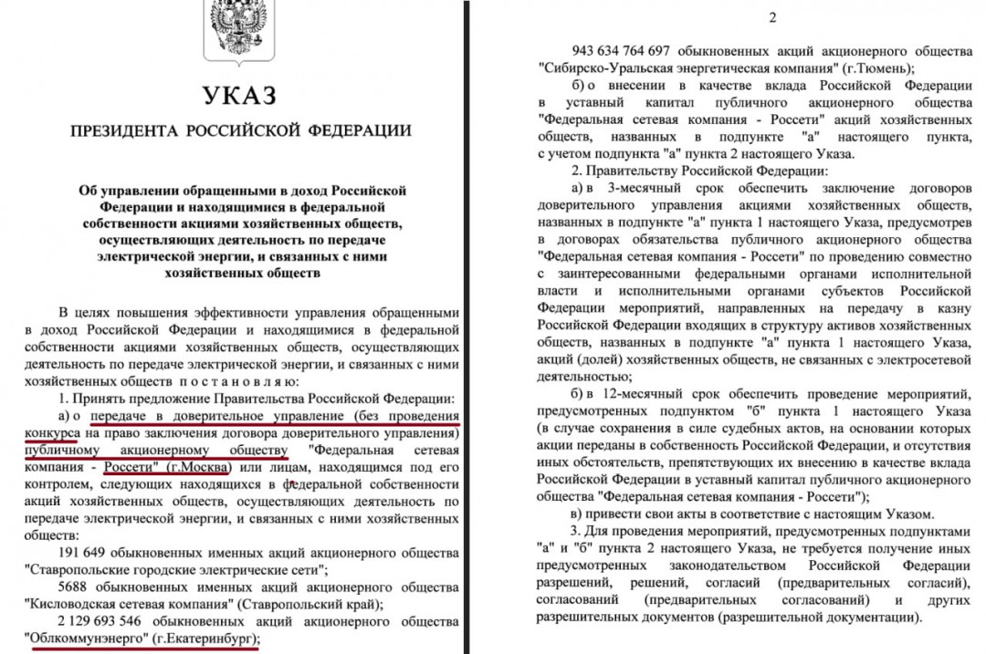 Президентским указом в доверительное управление без проведения конкурса государственной корпорации «Россети» были переданы акции «Облкоммунэнерго» и «Сибирско-Уральской энергетической компании».