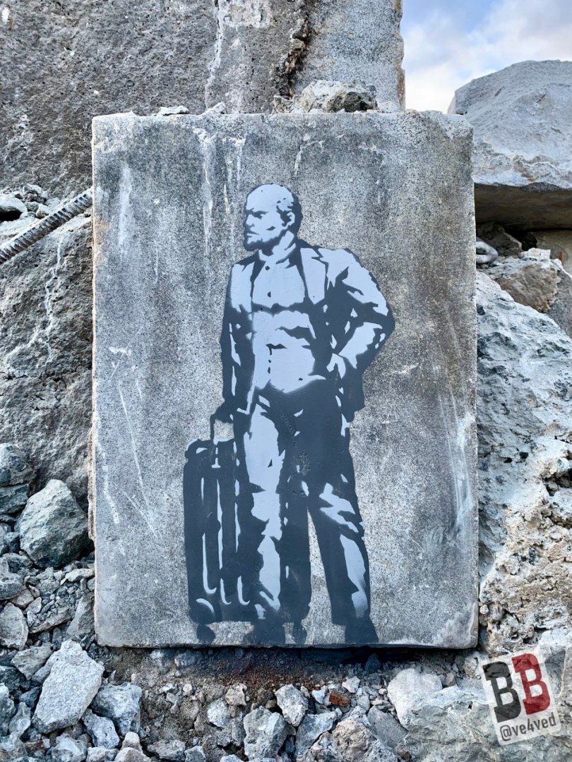 После демонтажа на развороченном постаменте памятника на площади Победы уличный художник из Екатеринбурга a11c1ear разместил арт-объект в виде Владимира Ульянова с багажным чемоданом.