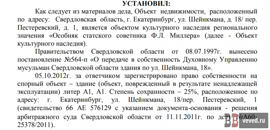 В прошлом году Свердлохранкультура подала к Централизованной религиозной организации «Региональное духовное управление мусульман Свердловской области в составе Центрального духовного управления мусульман России» иск об изъятии бесхозяйственно содержимого объекта культурного наследия, и 23 января 2025 года судья арбитражного суда Свердловской области Анастасия Михеева этот иск удовлетворила.
