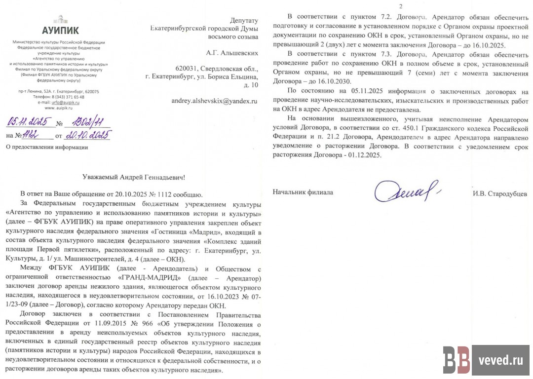 Причина в том, что компания за два года ничего не сделала для реставрации объекта культурного наследия, не подготовив даже научно-проектную документацию, говорится в ответе федерального агентства по управлению и использованию памятников истории и культуры (АУИПИК) депутату Госдумы от «Единой России» Андрею Альшевских.