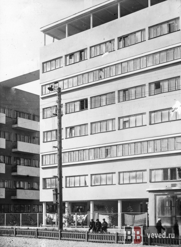 Восьмиэтажный корпус жилого комплекса до войны имел открытую террасу на верхнем этаже, а первый этаж частично стоял на колоннах